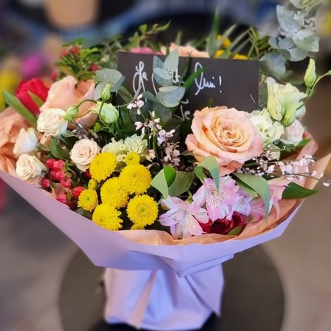 Buchet de flori asortat, este realizat din trandafiri, crizantema , alstromeria, hypericum, eustoma si verdeata decorativa.
