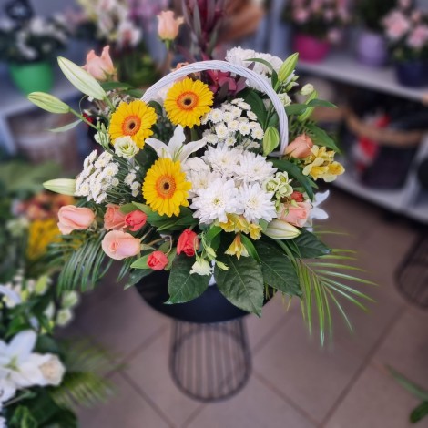 Aranjamentul este realizat din trandafiri, lalele, gerbera, crin crizantema și anthurium